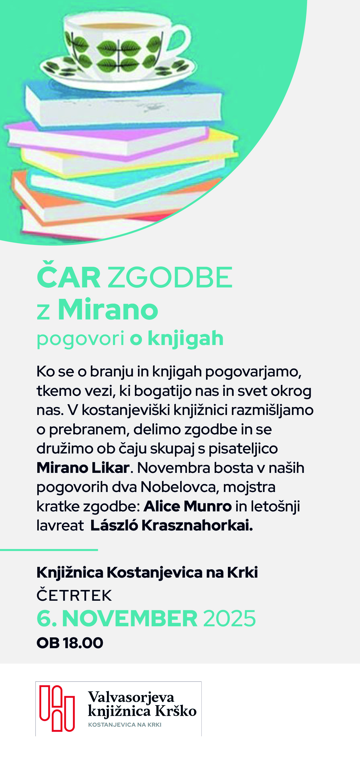 Ko se o branju in knjigah pogovarjamo, tkemo vezi, ki bogatijo nas in svet okrog nas. V kostanjeviški knjižnici razmišljamo o prebranem, delimo zgodbe in se družimo ob čaju skupaj s pisateljico Mirano Likar.