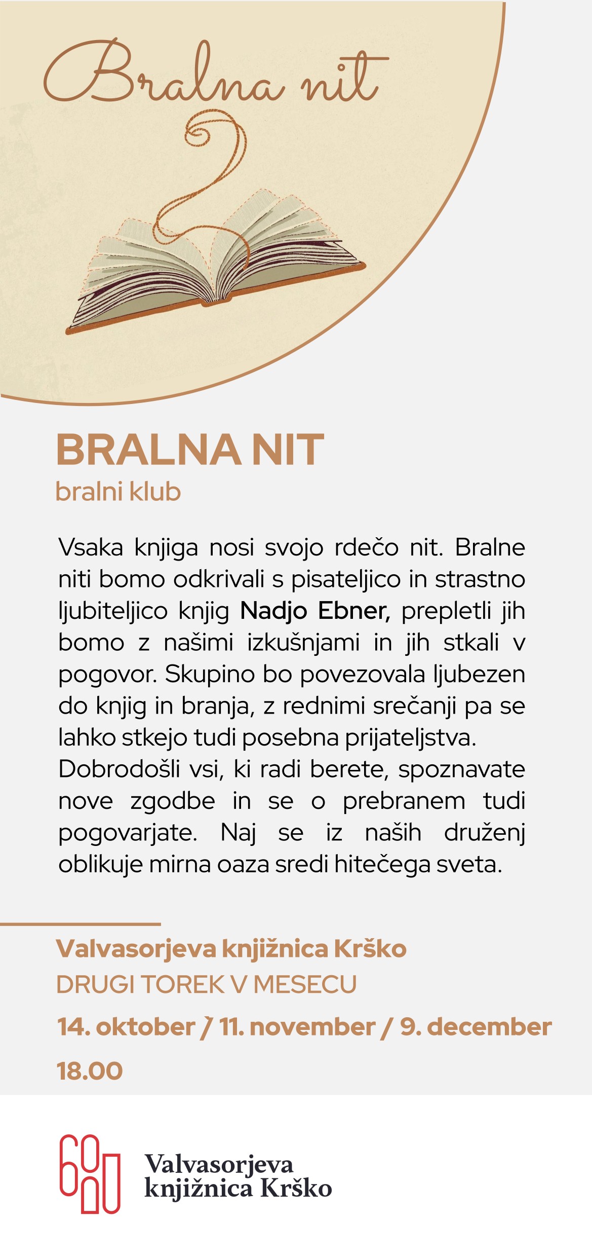 Vsaka knjiga nosi svojo rdečo nit. Bralne niti bomo odkrivali s pisateljico in strastno ljubiteljico knjig Nadjo Ebner, prepletli jih bomo z našimi izkušnjami in jih stkali v pogovor. Skupino bo povezovala ljubezen do knjig in branja, z rednimi srečanji pa se lahko stkejo tudi posebna prijateljstva.