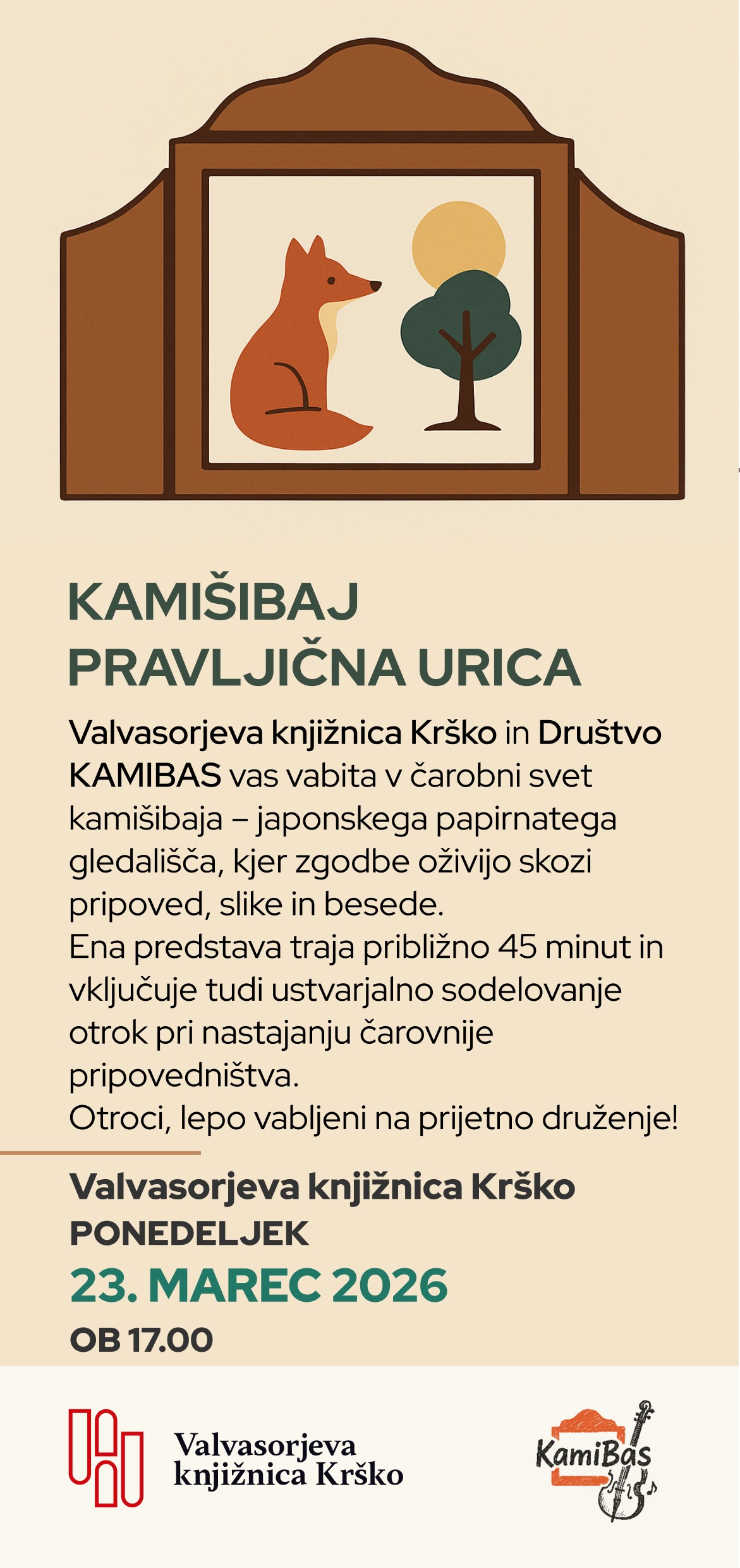Valvasorjeva knjižnica Krško in Društvo KAMIBAS vas vabita v čarobni svet kamišibaja – japonskega papirnatega gledališča, kjer zgodbe oživijo skozi pripoved, slike in besede. Ena predstava traja približno 45 minut in vključuje tudi ustvarjalno sodelovanje otrok pri nastajanju čarovnije pripovedništva.