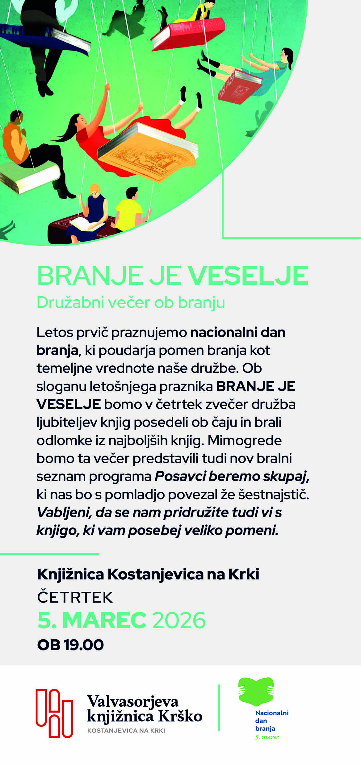 Letos prvič praznujemo nacionalni dan branja, ki poudarja pomen branja kot temeljne vrednote naše družbe. Ob sloganu letošnjega praznika BRANJE JE VESELJE bomo v četrtek zvečer družba ljubiteljev knjig posedeli ob čaju in brali odlomke iz najboljših knjig. Mimogrede bomo ta večer predstavili tudi nov bralni seznam programa Posavci beremo skupaj, ki nas bo s pomladjo povezal že šestnajstič.
