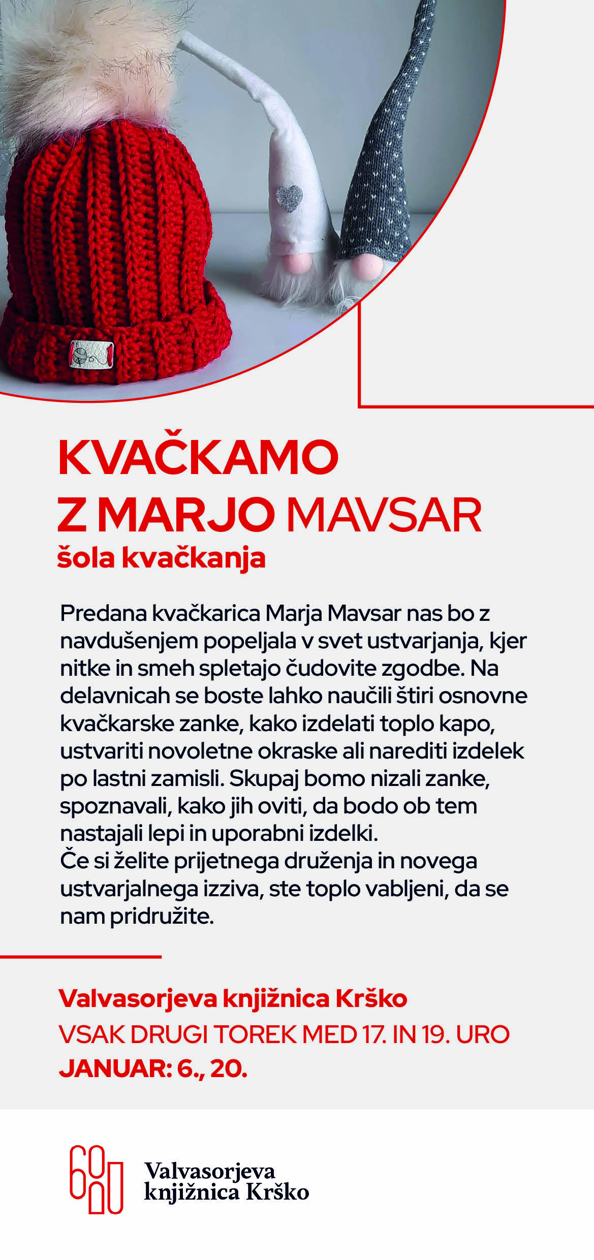 Predana kvačkarica Marja Mavsar nas bo z navdušenjem popeljala v svet ustvarjanja, kjer nitke in smeh spletajo čudovite zgodbe. Na delavnicah se boste lahko naučili štiri osnovne kvačkarske zanke, kako izdelati toplo kapo, ustvariti novoletne okraske ali narediti izdelek po lastni zamisli. Skupaj bomo nizali zanke, spoznavali, kako jih oviti, da bodo ob tem nastajali lepi in uporabni izdelki.
