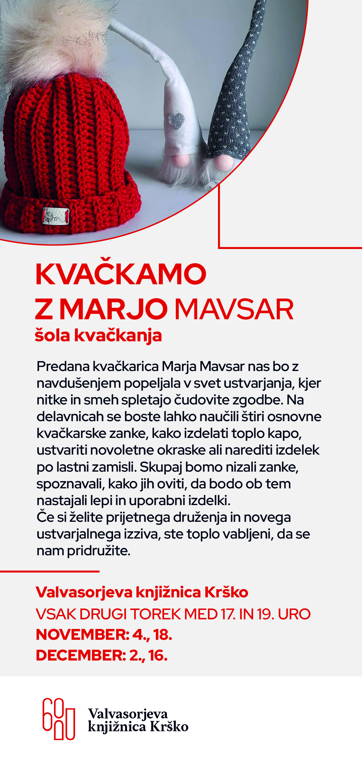 Predana kvačkarica Marja Mavsar nas bo z navdušenjem popeljala v svet ustvarjanja, kjer nitke in smeh spletajo čudovite zgodbe. Na delavnicah se boste lahko naučili štiri osnovne kvačkarske zanke, kako izdelati toplo kapo, ustvariti novoletne okraske ali narediti izdelek po lastni zamisli. Skupaj bomo nizali zanke, spoznavali, kako jih oviti, da bodo ob tem nastajali lepi in uporabni izdelki.
