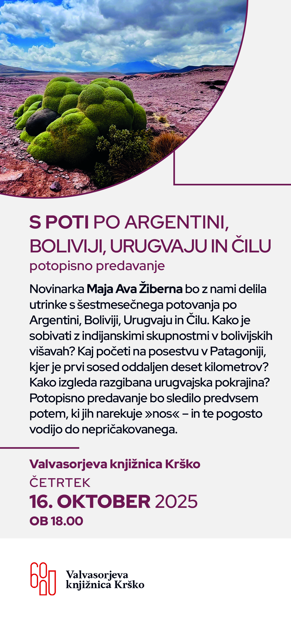 Novinarka Maja Ava Žiberna bo z nami delila utrinke s šestmesečnega potovanja po Argentini, Boliviji, Urugvaju in Čilu. Kako je sobivati z indijanskimi skupnostmi v bolivijskih višavah? Kaj početi na posestvu v Patagoniji, kjer je prvi sosed oddaljen deset kilometrov? Kako izgleda razgibana urugvajska pokrajina? Potopisno predavanje bo sledilo predvsem potem, ki jih narekuje »nos« – in te pogosto vodijo do nepričakovanega.